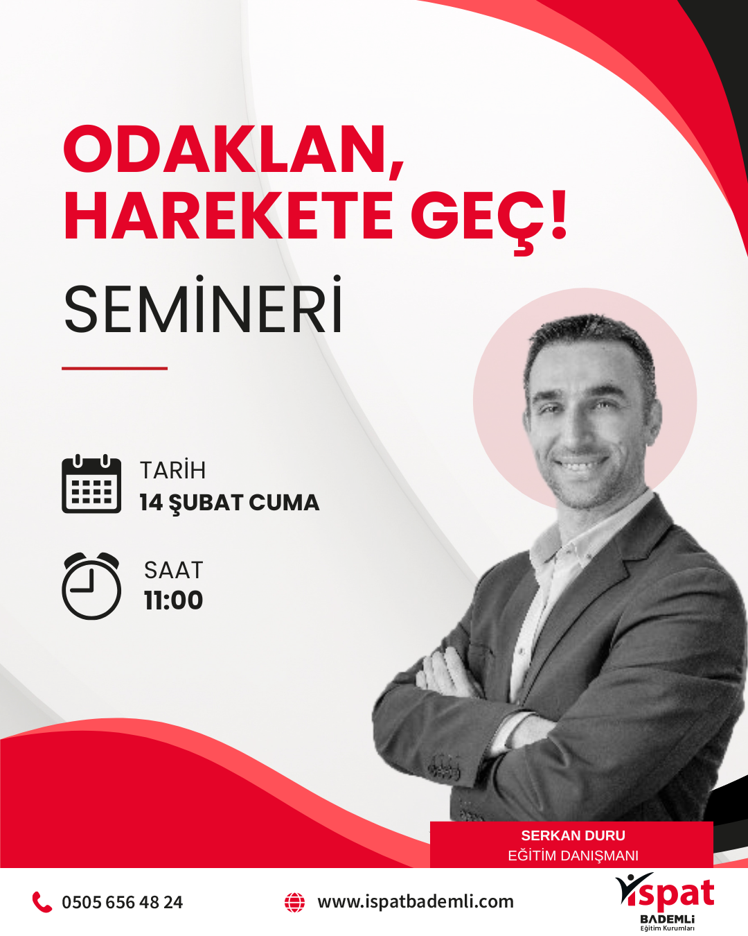 Eğitimci-yazar Serkan DURU, 11. ve 12. sınıf öğrencilerimiz için düzenlenecek “Odaklan, Harekete Geç” başlıklı YKS motivasyon semineri ile bizlerle olacak.